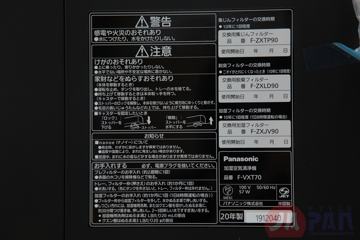 Thông số kỹ thuật Máy lọc không khí Panasonic F-VXT70-TM |2020| |Bù ẩm| Made in Japan