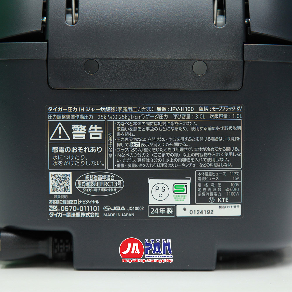 Thông số kỹ thuật của nồi cơm điện Tiger JPV-H100-KV | Nội địa Nhật