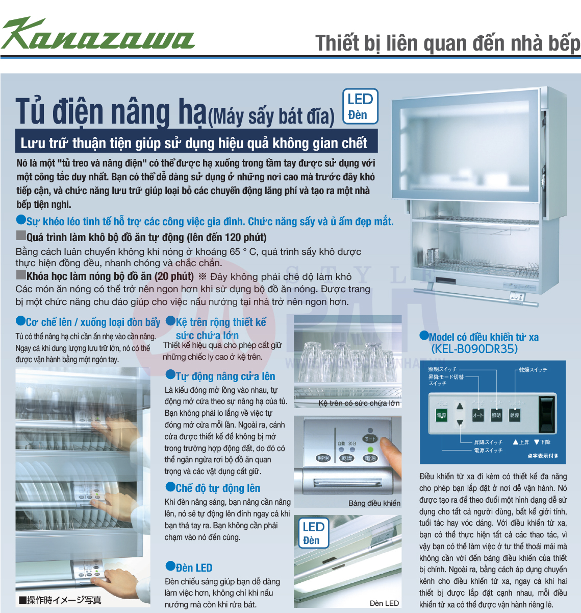 Thông số kỹ thuật Tủ sấy bát – chạn bát nâng hạ điện Kanazawa KEL-B090D35 New 2022 | Tích hợp sấy khô